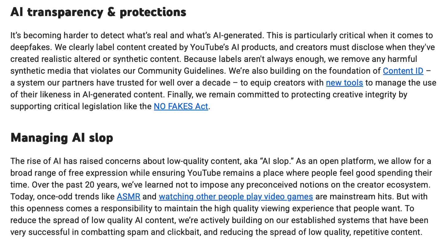 尼尔 · 莫汉同时指出,平台正在其原有的反垃圾和标题党系统基础上,积极构建新机制,以减少传播低质量、重复性 AI 内容。他强调,YouTube 将移除任何违反社区准则的“有害合成媒体”,并为创作者提供识别和屏蔽深度伪造内容的工具。