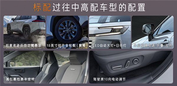 配置同样有诚意,标配LED自动大灯+日行灯、外后视镜电动调节、18英寸熏黑铝合金轮毂、运动型座椅,甚至驾驶位支持10向电动调节,对于丰田而言,属实有诚意。