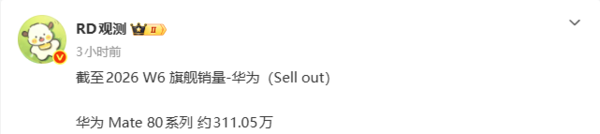 近日,超百数码博主“RD观测”公布了华为Mate 80系列的最新最新销量数据,截至2026年第6周,销量Mate 80系列的览上累计销量达到311.05万台。