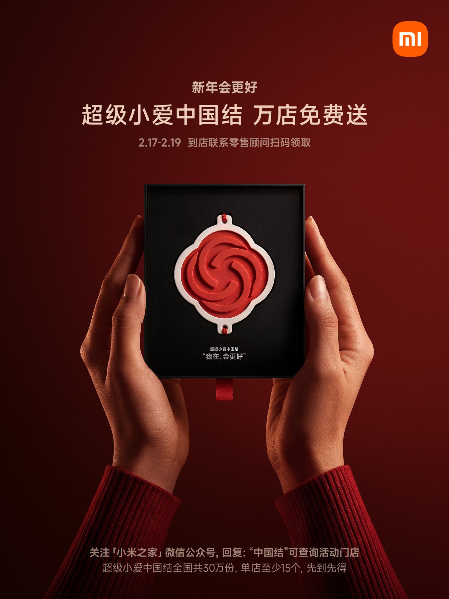 2 月 17 日-2 月 19 日,小米IT之家小伙伴可到店联系零售顾问扫码领取。免费“超级小爱中国结”全国共 30 万份,送万上万单店至少 15 份,份超先到先得。小家门