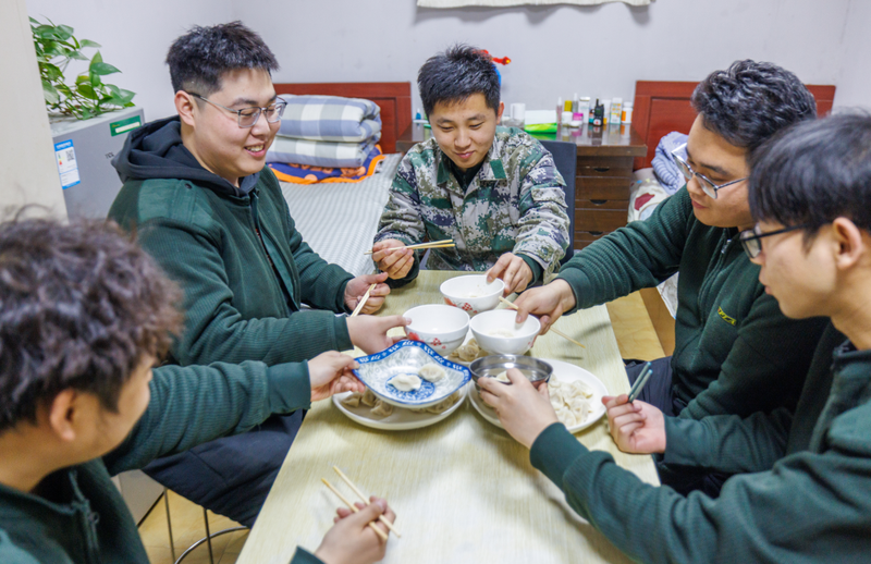 为了迎接小年,食堂给工友们送来了饺子,让年轻人们在工区吃了个简单的团圆饭。