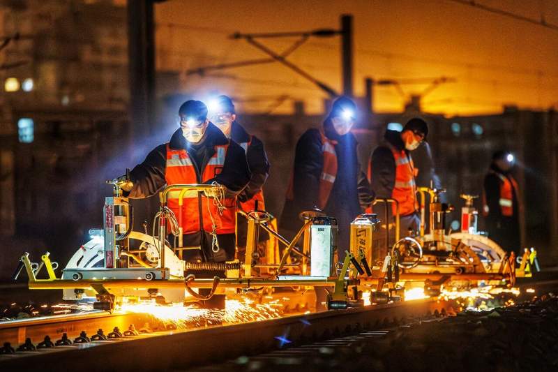2月10日凌晨,北京南站,工人们推动打磨机为铁路轨道实施“毫米级”修整。欧亿