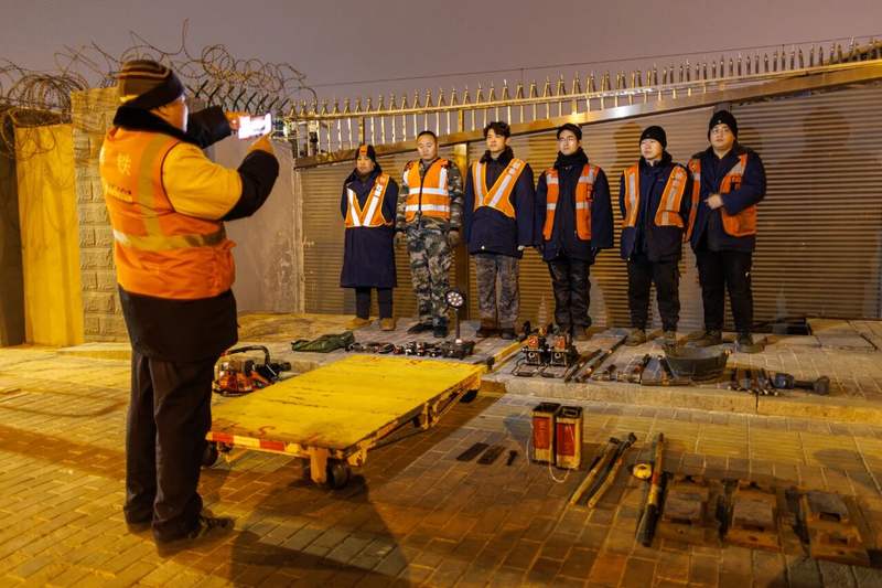 2月10日凌晨0时,北京南站,施工作业区外,担任更换尖轨滑床板作业任务的小组将人员与器材合影。结束作业时,还将再拍摄一张照片,确保器材人员全部撤出。当晚,多支小组进入现场作业,确保充分使用“天窗时间”。
