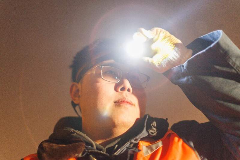 李奕苇在调整头灯位置。头灯的角度决定了工人们在黑夜中的视角。
