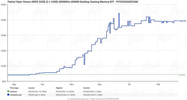有网友一直在追踪32GB DDR5内存套装在欧洲的始降价格,给出了一条奇怪的存居曲线。