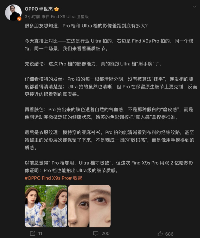 OPPO Find 系列负责人卓世杰近日现身微博发声。他坦言,即将登场的 Find X9 Ultra 与 Find X9s Pro,实现了从底层光学架构到实拍体验的全方位革新,绝非常规迭代升级。同时他晒出 Find X9s Pro 与行业 Ultra 机型的 2 亿长焦实拍对比样张,并直言:“这次 Pro 档的影像实力,完全有底气和 Ultra 机型正面较量。”