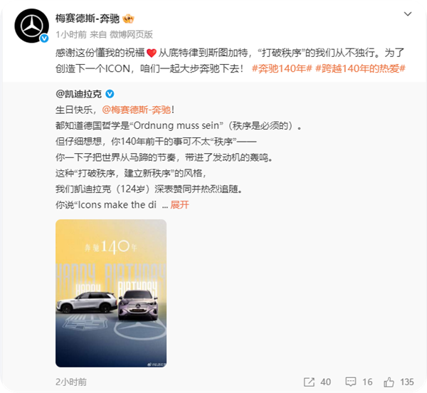此外,凯迪拉克、鸿蒙智行、理想、蔚来、吉利等多家汽车品牌,也相继向奔驰致以诚挚的生日祝福。