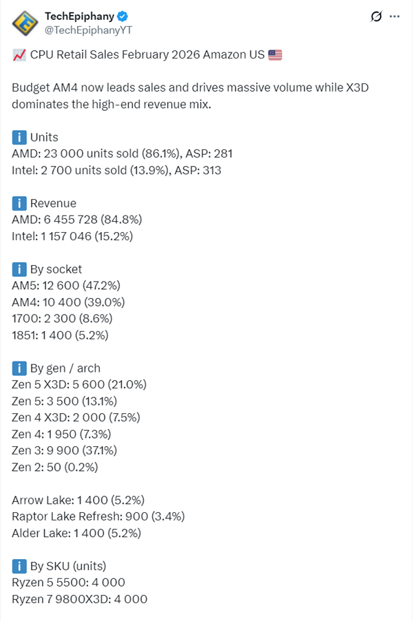 AMD依然牢牢占据主导地位,在2月的销量中,AMD处理器占比高达86.1%,售出约23000颗,平均售价281美元;Intel仅售出2700颗,均价313美元。