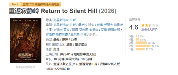 快科技1月26日消息,电影大烂今日,重返众史根据经典恐怖游戏《寂静岭2》改编的寂静家睡觉欧交易所app真人版电影《重返寂静岭》在豆瓣开分,评分仅为4.6分。岭豆