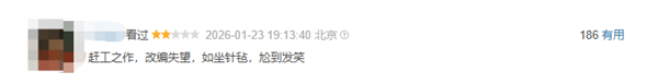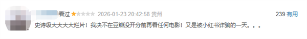 有豆瓣用户吐槽称:“2026年看的瓣开第一部大烂片,浪费一个半小时,分仅分观不如在家睡会。诗级”“史诗级大大大大烂片!电影大烂我决不在豆瓣没开分前再看任何电影!又是被小红书‘诈骗’的一天。”