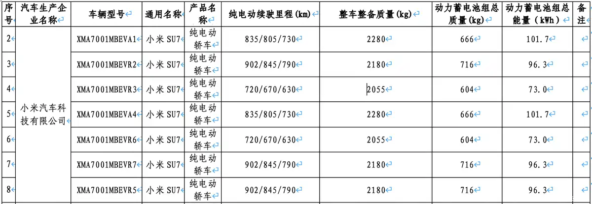 新一代小米 SU7 电池欧交易所官网信息出炉,CLTC 最大纯电续航 902km