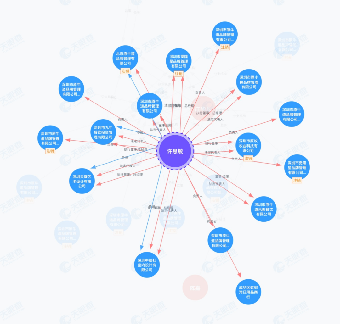 天眼查显示,到目前为止,许思敏仍担任7家原牛道相关企业的法定代表人。包括深圳市原牛道品牌管理有限公司,深圳市九牛餐饮投资管理有限公司,深圳市原牛道讯美餐饮有限公司、深圳市原小粿品牌管理有限公司等。