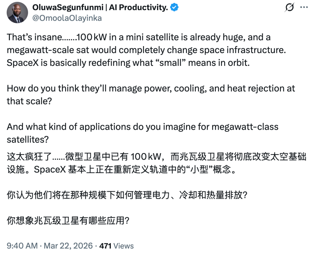 对于兆瓦级别的微型卫星设想,网友惊叹不已: