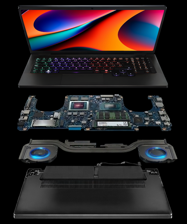 该笔记本电脑内置 2 个 DDR5 SO-DIMM 内存插槽、电脑2 个 M.2 PCIe Gen4 ×4 NVMe 盘位,配备 1.4mm 键程 RGB 背光键盘、5.7" 触控板,拥有联发科 MT7922A22M Wi-Fi 6E 无线网卡。