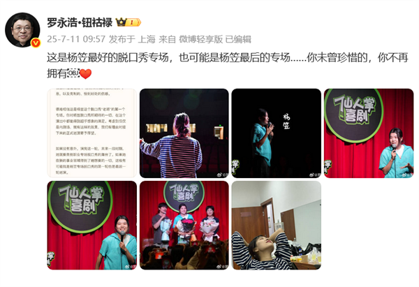罗永浩晒出多张照片写道:有幸提前看了杨笠即将全国巡演(其实也是全球巡演)的脱口秀专场的内测场。毫无疑问,这是迄今为止,最好的杨笠脱口秀。很难相信这是杨笠这个脱口秀“老将”的第一个专场。