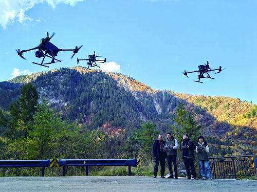 左图为团队通过多机协作飞行采集数据,右图为无人机监测到的熊猫海植被生态景观恢复状况。