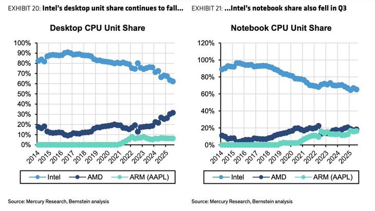 近日,结合Mercury Research收集及Bernstein Research分析的数据显示,自2020年11月苹果推出首款基于Arm架构的定制化M1芯片、正式开启Mac产品线从英特尔处理器向自研芯片的转型以来,其自研芯片业务取得了跨越式进步。经过五年的生态系统建设,苹果自研芯片在笔记本电脑市场的份额已逐步逼近长期供应商AMD,形成了旗鼓相当的竞争态势,这一成绩在苹果自研芯片应用于MacBook笔记本和Mac台式机即将迈入第六年之际,显得尤为亮眼。目前AMD在笔记本电脑芯片市场的份额长期稳定在20%左右,具体约为21%至22%;而苹果自研芯片的市场份额已攀升至18%至19%,与AMD的差距持续缩小。值得注意的是,苹果市场份额的提升主要来自对英特尔市场份额的挤压,目前英特尔在笔记本电脑芯片市场的份额已降至60%左右,且仍有波动下滑趋势。在台式机芯片市场,苹果同样实现了突破,占据了约10%的市场份额,不过该领域目前仍由英特尔和AMD主导,与笔记本电脑市场不同的是,英特尔在台式机市场流失的份额主要流向了AMD,这也反映出当前PC芯片市场的竞争格局差异。