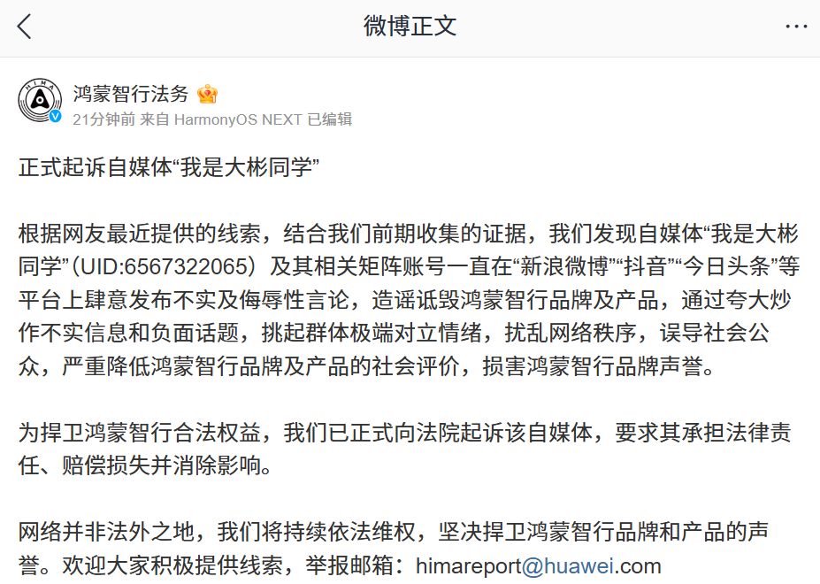 鸿蒙智行起诉“我是大彬同学”一审欧交易所app下载安卓判决:判令被告删除侵权言论、公开赔礼道歉,并赔偿 150 万元