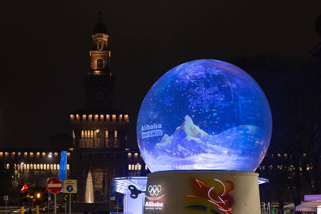 "米兰·阿里廊"是阿里巴巴在米兰斯福尔扎古堡前广场设置的体验馆,于米兰冬奥会和残奥会期间对游客开放。展馆由一颗直径8.8米的透明水晶球和一座总长约30米的冰晶穹顶组成。水晶球白天作为互动空间,夜间变身为AI生成视觉内容的投影表面。