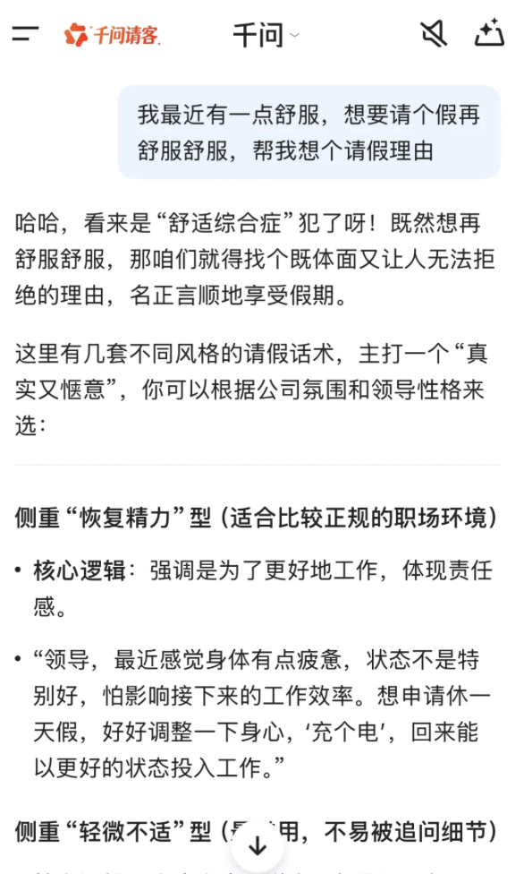 而有的朋友则大大方方地说“不想上班,帮我请个假”,主打实诚。也有人选择“不走寻常路”,选择用“领导,我明天可能要感冒,能不能请一下假?”,未卜先知;也有人选择无法无天地请假:“领导好,我最近有一点舒服,想要请假再舒服舒服”。