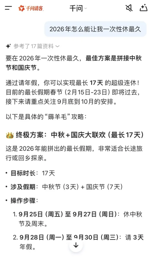 对此,千问的建议是这些朋友可以收收心,慢慢调整回工作状态。当然如果实在不想上班,也可以将中秋、国庆假期和年假凑一凑,组成 17 天的“拼好假”。