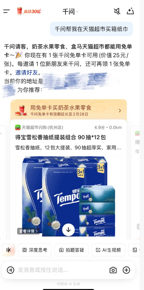 2月7日,千问APP提示,用户也可以使用「免单卡」在千问内购买盒马的居家日用、水果生鲜、零食酒水、粮油米面,无论买鱼、买菜还是买蛋糕,最快30分钟就能送到家门口。