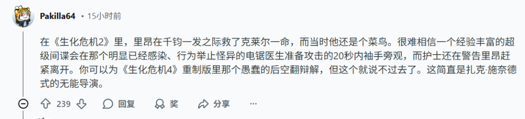 卡普空官号下的讨论基本全是“里昂见死不救”在相关的讨论区里也展开了不少讨论,但不论是从里昂的能力还是性格上看,很多人认为卡普空这种编排难以服众。