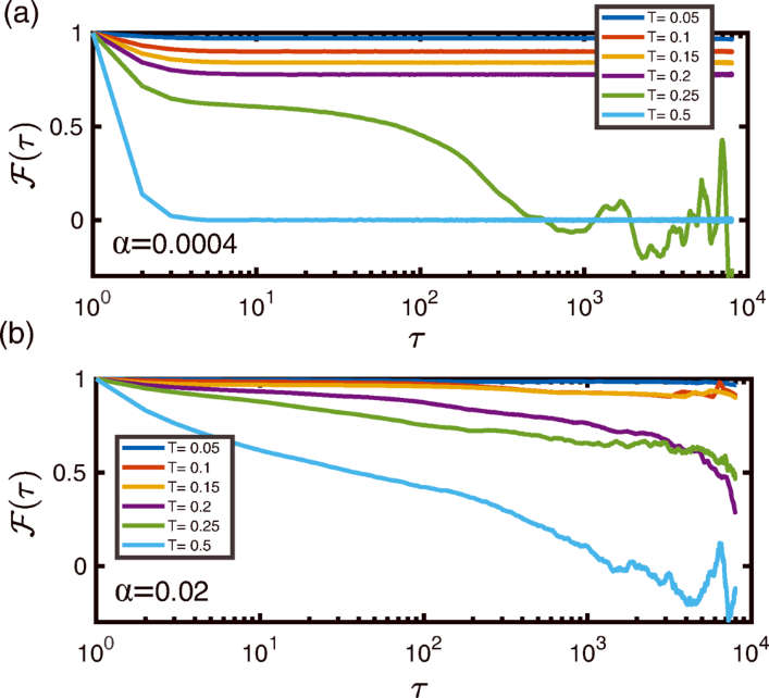 图 | 模拟数据显示了系统在不同条件下的记忆能力。(a) 当存储负荷较低时(α=0.0004),曲线趋于平稳;(b) 当存储负荷过高时(α=0.02),曲线快速衰减。(来源:https://journals.aps.org/prl/abstract/10.1103/945c-11wt)