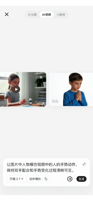 基于参考视频动作,千问可以让生成画面中的人物复刻相同动作,包括多人协同或较复杂的动作变化。