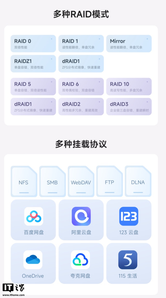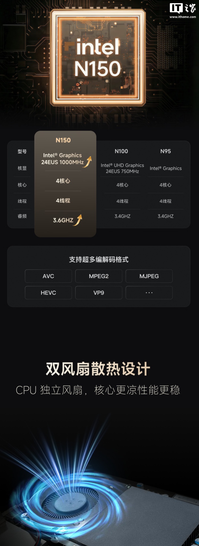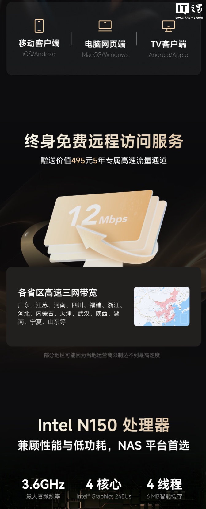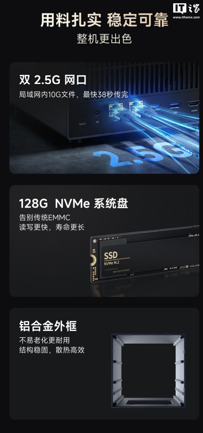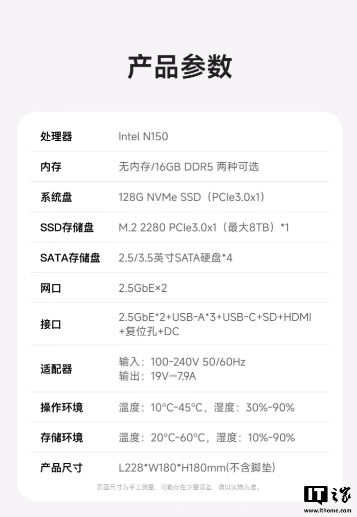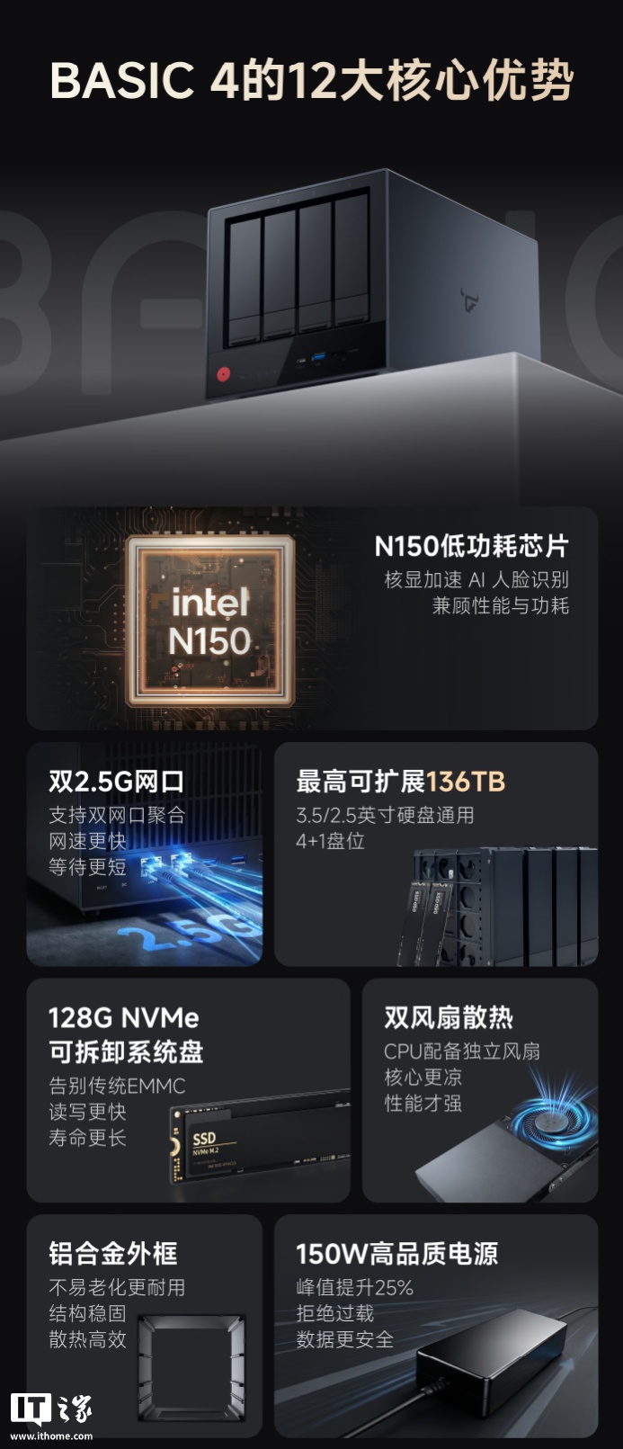 参数方面,存储存这款 NAS 搭载英特尔 N150 处理器,上架双G手拥有 4 核心 4 线程架构,最高睿频 3.6GHz,配备双风道散热设计,自带高品质 150W 大电源,可选 16GB DDR5 内存,拥有双 2.5G 网口、128GBNVMe 系统盘,外框采用铝合金材质。