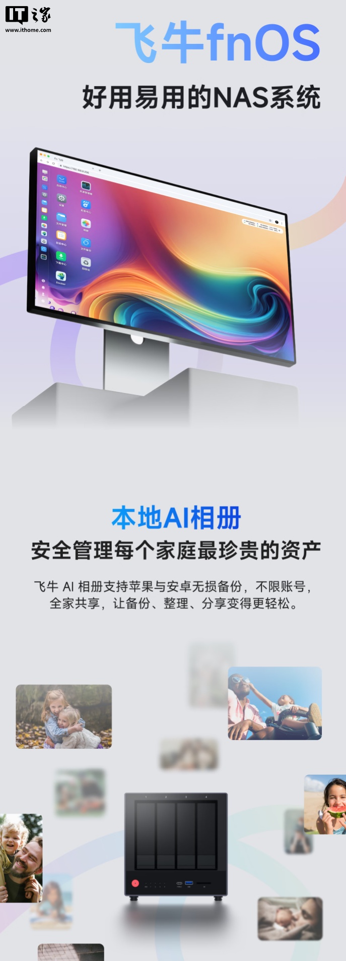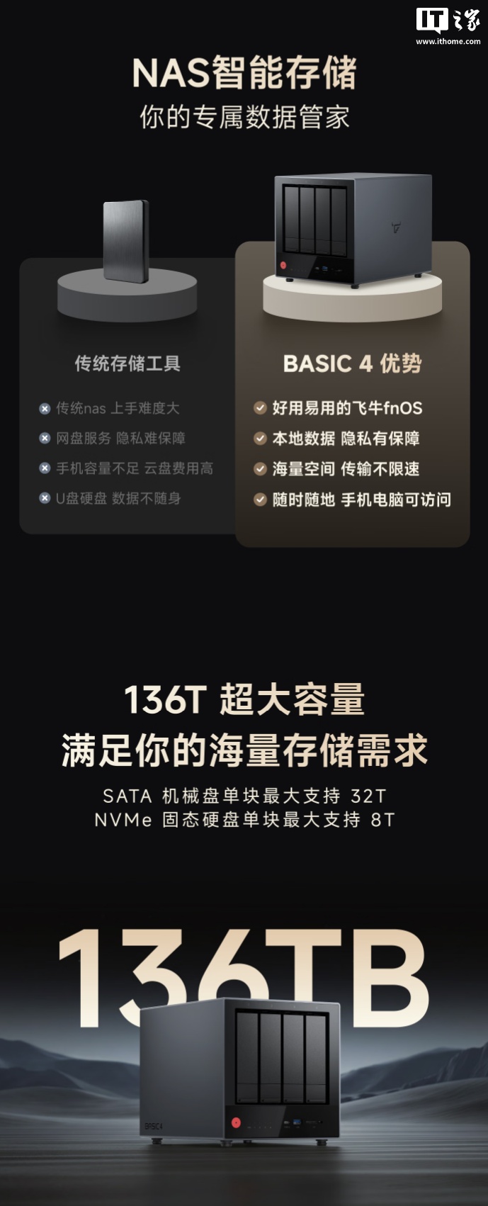 - 飞牛 Basic 4 四盘位 NAS 家庭存储上架:双 2.5G 网口,无内存 +128GB 到手价 1999 元