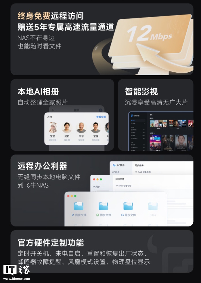 此外,这款 NAS 搭载飞牛 fnOS 操作系统,支持本地 AI 相册、智能影视中心等,兼容 RAID0、1、Z1、D1 等多种 RAID 模式,拥有丰富 Docker 扩展,内置虚拟机功能。支持多重安全防护。