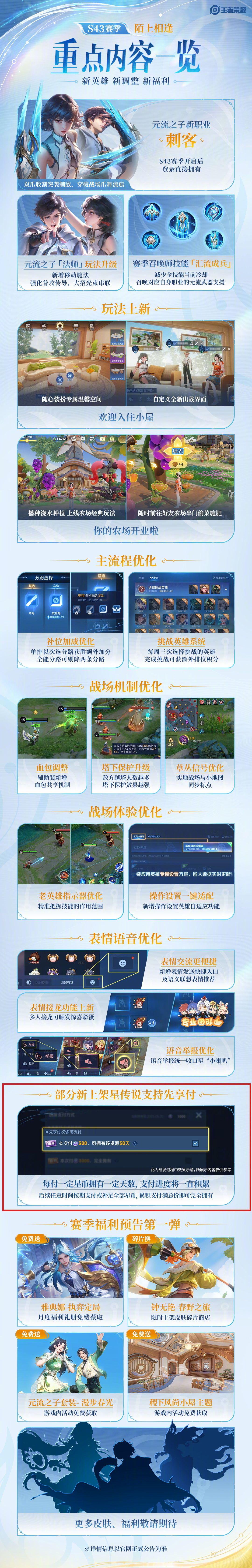 腾讯《王者荣耀》官方还发布了 S43 新赛季重点内容一览,赛季其中提到了“部分新上架星传说支持先享付”,陌上这一功能也被玩家认为是官宣皮肤的“分期付款”。