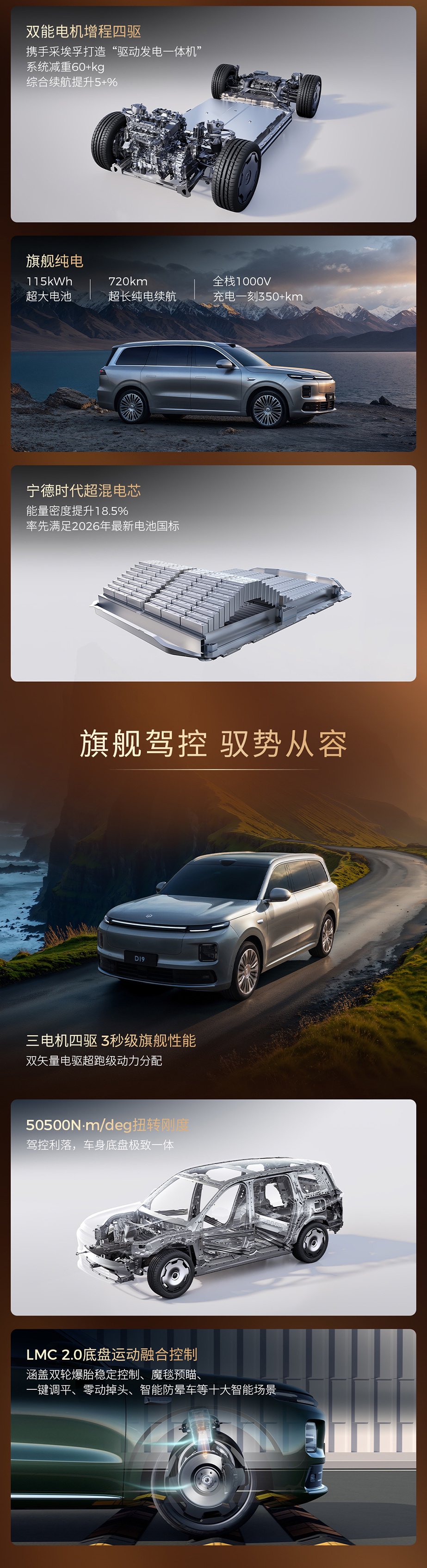 零跑 D19 增程版搭载增程 CTC 电池技术,系统综合功率 400 千瓦,轮端扭矩 7850 牛・米,配备 80.3kWh 大电池,支持 800V 快充;纯电续航里程可达 500km,并配备智能四驱系统。