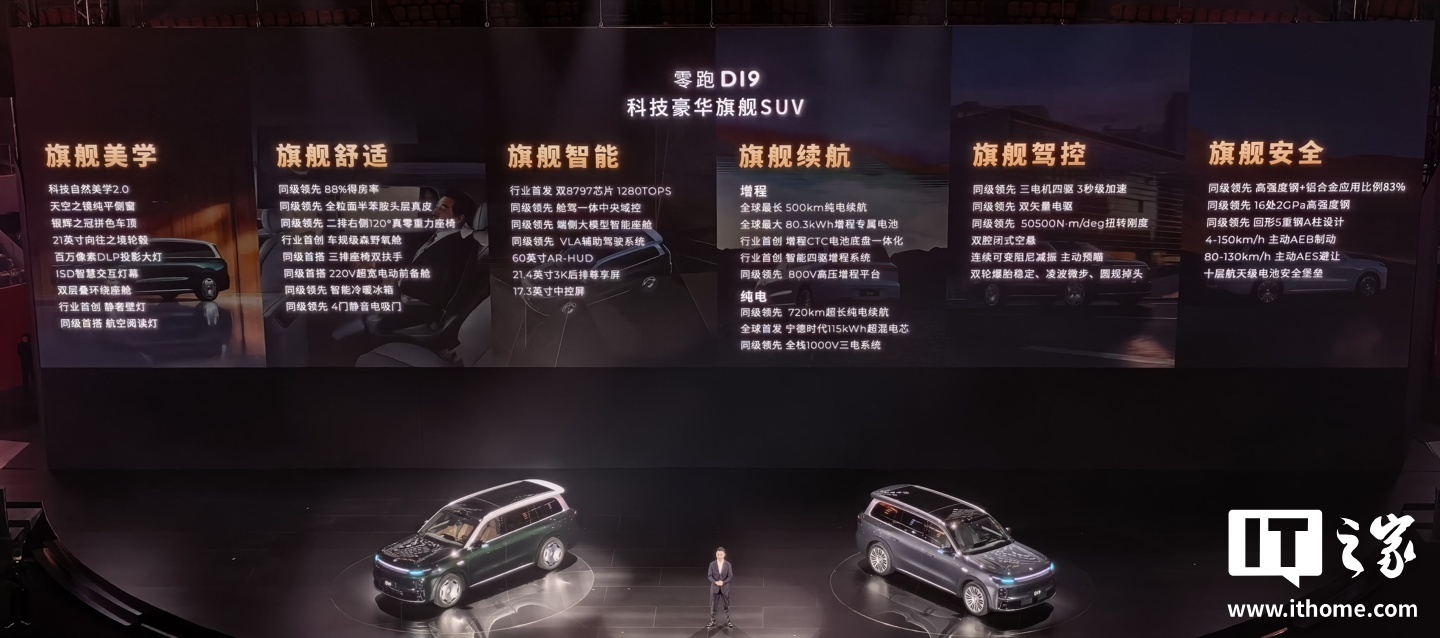 智能化方面,零跑 D19 全球首搭高通骁龙 1280Tops 双 8797 芯片,舱驾一体中央域控、VLA 辅助驾驶系统。安全性方面,新车全身 16 处采用 2GPa 高强度钢。