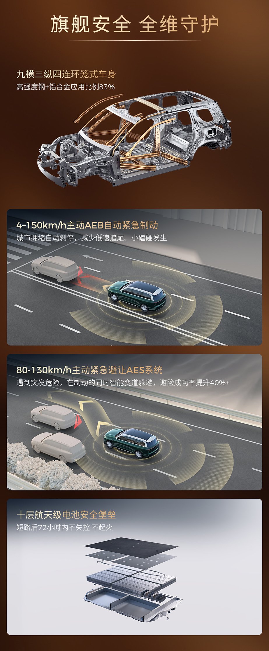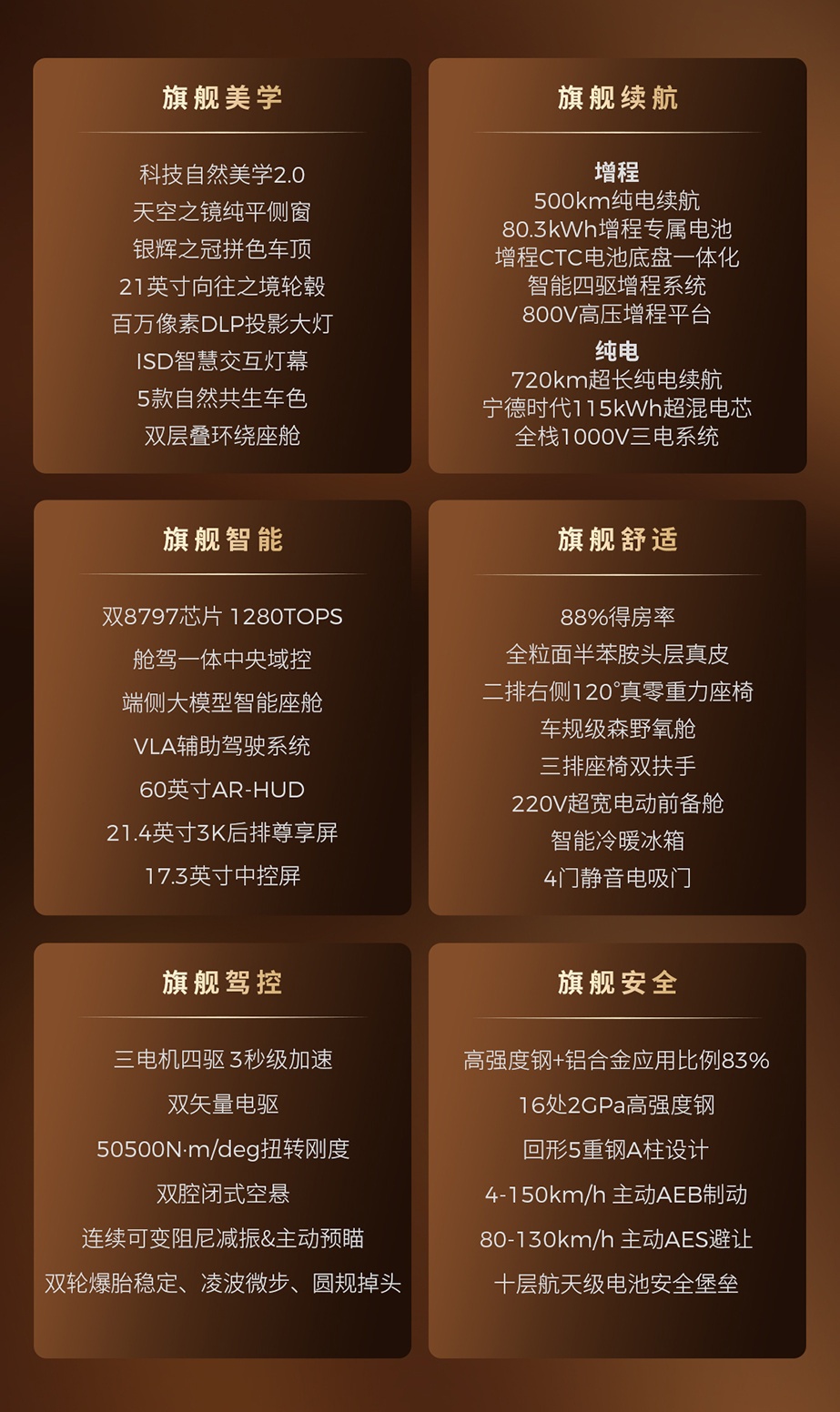 驾控性能方面,新车搭载 3 电机矢量控制,百公里加速在 3 秒级。此外,新车还搭载双轮爆胎稳定、凌波微步,圆规掉头。底盘方面,新车搭载双腔闭式空悬和 CDC 减振,拥有 50500N・m/deg 扭转刚度。