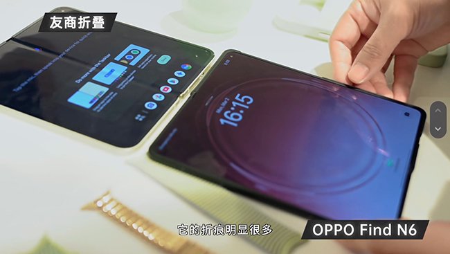 随后,惊近乎她选用海外用户熟知的友商折叠屏机型,在相同光线条件下进行直观对比。画面中清晰可见,友商机型内屏折痕明显,而 OPPO Find N6 内屏近乎无痕,两者差距一目了然。