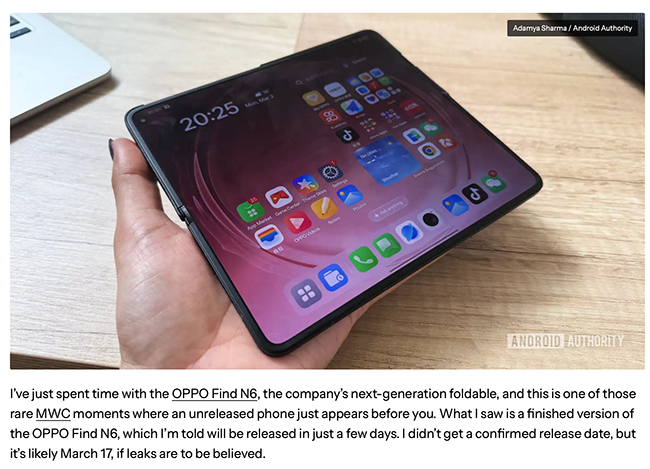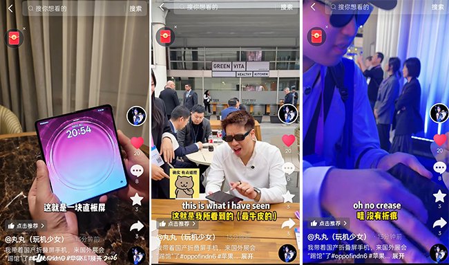 除王冰汝外,数码博主玩机少女也携同款 OPPO Find N6 亮相 MWC,并带来一场趣味互动。她将手机递给现场海外博主与媒体记者,戏称其为苹果尚未发布的折叠屏新品。外媒上手后,均对屏幕平整度赞不绝口,直言 “苹果首款折叠屏就能做到近乎无折痕,十分意外”。在收获一众好评后,玩机少女揭晓真相,告知这是 OPPO Find N6,现场外媒在恍然大悟之余,也对 OPPO 的折叠屏技术实力惊叹不已。