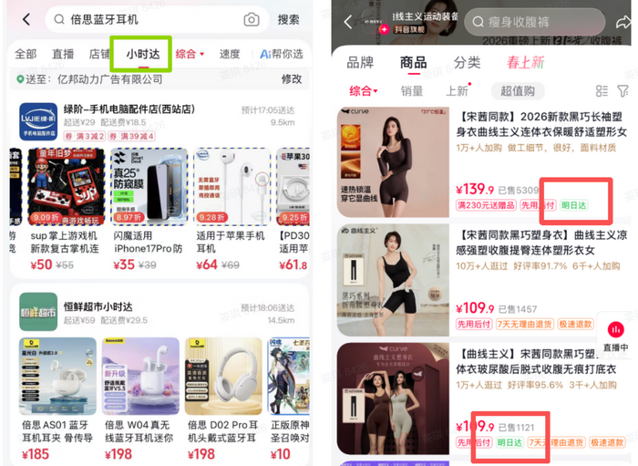 目前在抖音商城搜索商品时,页面会出现小时达标签,用户可从中选择时效更优的“明日达”商品,整体呈现方式趋近于淘宝、京东等传统电商平台。进入店铺后,系统还会根据收货地址自动为可明日送达的商品打标,部分商品还会显示 “隔日达” 标识。
