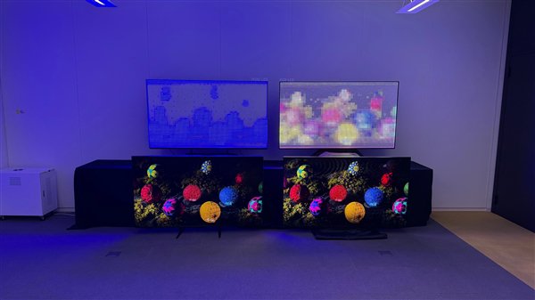 闭门演示环节展示了两台样机,一台是索尼75寸Bavia 9电视,另一台是75寸True RGB电视,上方则摆出对应的背光结构: