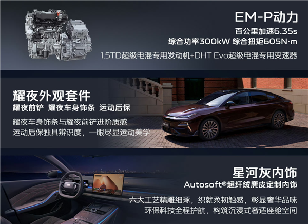 动力上,新车采用1.5T发动机+电机组成的EM-i插混系统,综合功率300kW,峰值扭矩605N·m,匹配DHT变速箱,零百加速6.35秒,百公里油耗低至3L级。