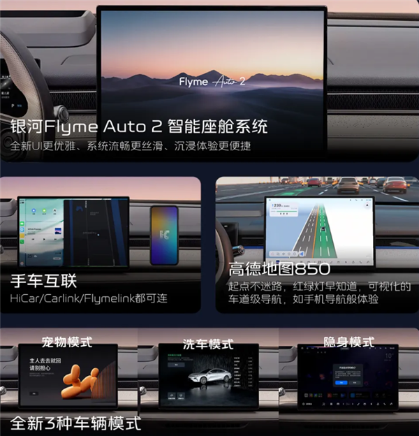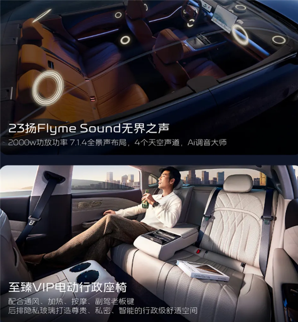车内搭载15.4英寸中控屏,内置Flyme Auto2代系统,标配全景天幕、前排座椅通风/加热/按摩、主驾按摩、副驾老板键。