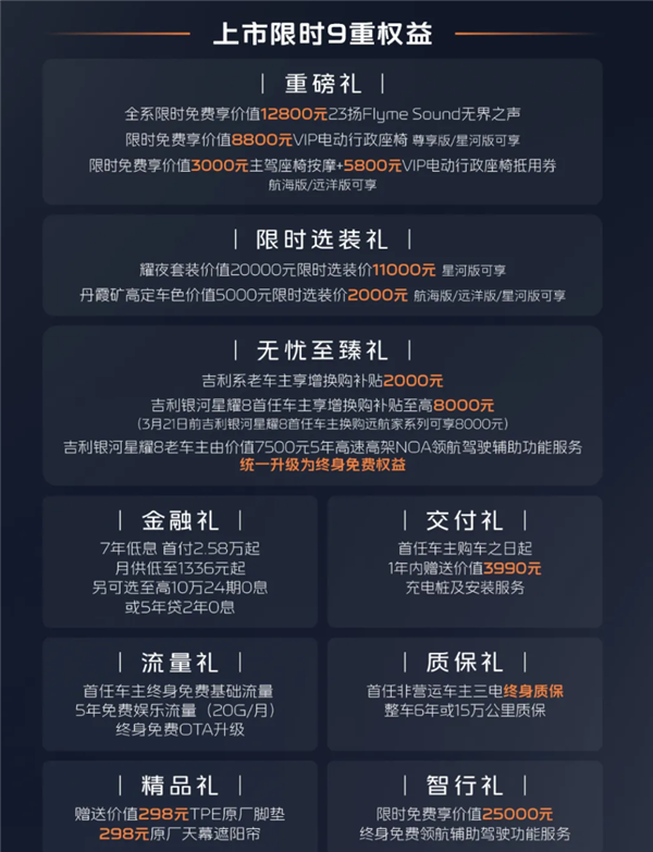 权益方面,河星航4月30日前提车,耀远可免费赠送价值12800元23扬Flyme Sound无界之声音响、纯电价值8800元VIP电动行政座椅(尊享版/星河版可享)、续航价值3000元主驾座椅按摩+5800元VIP电动行政座椅抵用券(航海版/远洋版可享)。升级上市