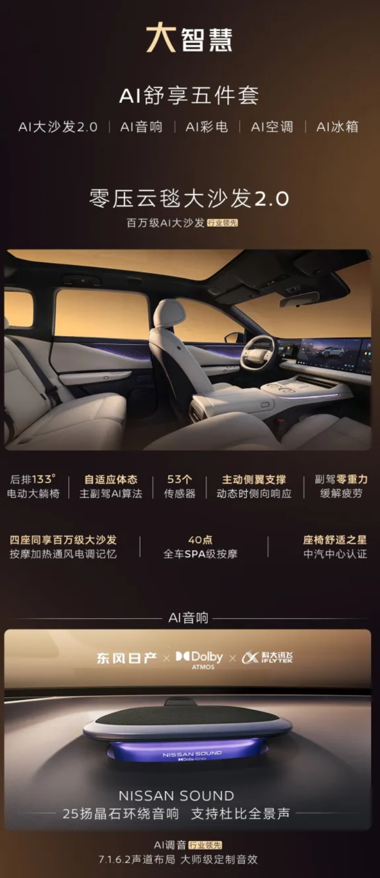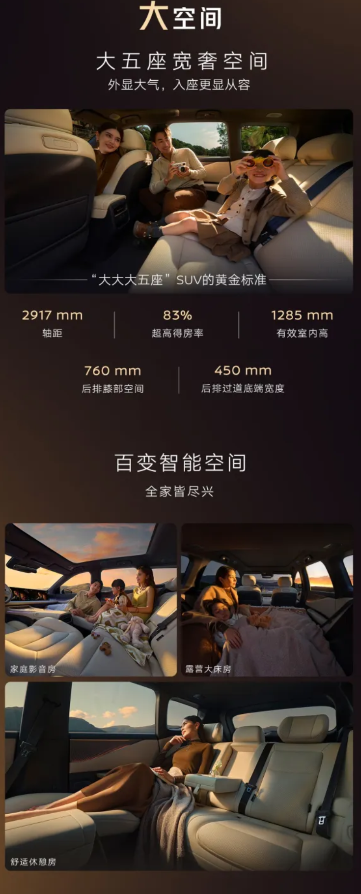 内饰方面,该车有效室内高 1285mm,拥有 95L 灵活前备箱、773L 超大双层后备箱,拥有零压云毯大沙发 2.0,后排角度 133°,全车带有 40 点 SPA 级按摩,拥有 25 扬声器环绕音响,支持杜比全景声,配备双 15.6 英寸超大联屏、10.25 英寸仪表屏,搭载-6°C-55°C 冷暖双用冰箱。