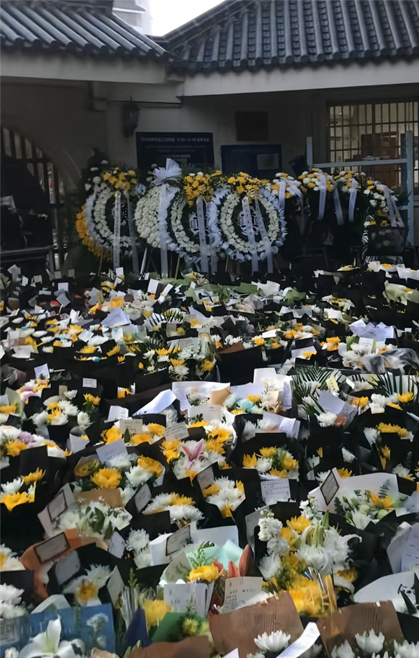 殡仪馆门口地面上摆满了很多苏州市民送来的峰追花圈和花篮,附近鲜花店里的今日举行花束已经卖光,店员正在紧急调运。